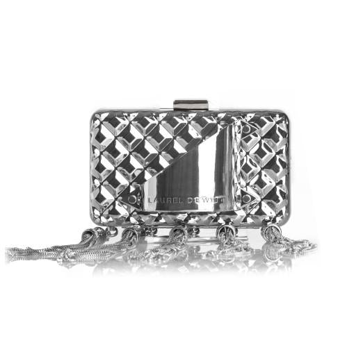 The structured, hinged case features a kiss-lock closure for secure storage, with a detachable snake chain shoulder strap for versatile styling. Inside, the clutch is lined with Laurel DeWitt’s signature satin chain-print fabric, adding a touch of refinement.
